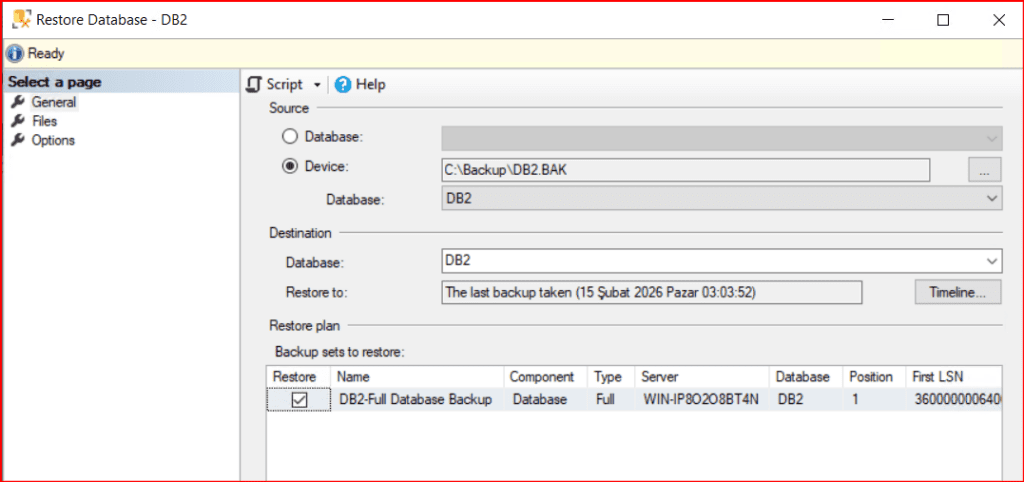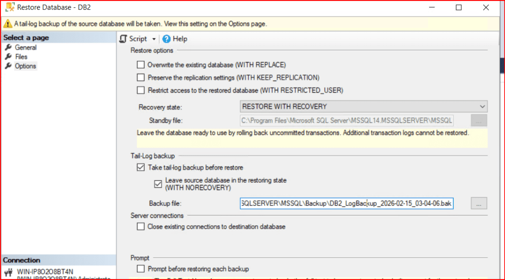 Eğer restore edilecek veritabanı instance altında bulunmazsa Tail log backup ifadesi görünmez. Eğer database mevcutta varsa bize mevcutta olan veritabanının tail log backup’ını aldırmaktadır.