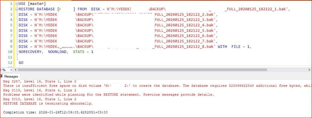 Yukarıdaki hata mesajı incelendiğinde Restore yapılan veritabanı disk boyutunun yetersiz olduğunu söylemektedir. Bu sebepten backup işlemini sonlandırdığını hata mesajı olarak düşmektedir.