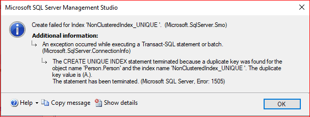 The CREATE UNIQUE INDEX statement terminated because a duplicate key was found for the object name ‘Person.Person’ and the index name ‘NonClusteredIndex_UNIQUE ‘. The duplicate key value is (A.).