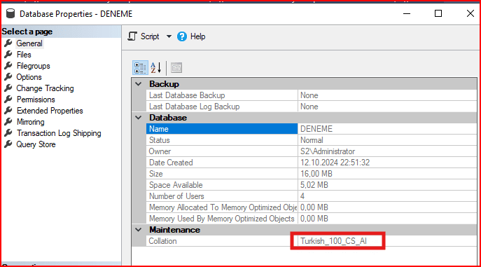 Bu örneğimizi DENEME veritabanımız üzerinde uygulamalı bir şekilde görelim. Veritabanımızın hangi collation’da olduğunu properties ekranından General sekmesinde görebiliriz.