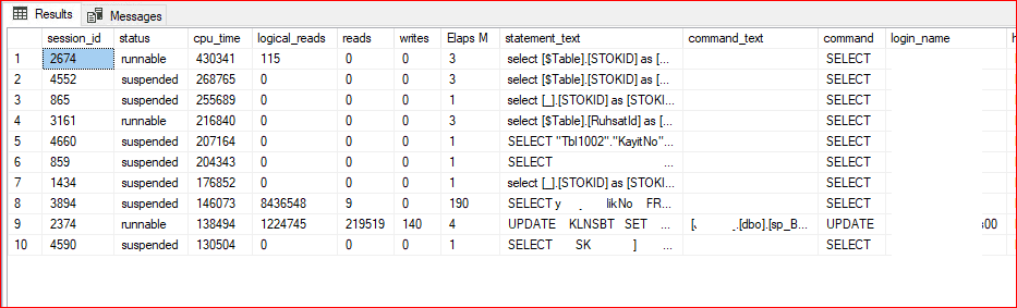 • r.cpu_time & r.logical_reads: Sorgunun işlemciyi ne kadar yorduğunu ve bellekten (buffer cache) ne kadar veri okuduğunu gösterir. Çoğu zaman CPU yüksekliğinin sebebi, eksik indeksler yüzünden yapılan aşırı logical okumalardır.