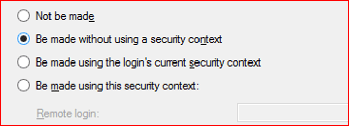 “Be made without using a security context” seçeneği kullanıldığında, SQL Server, bağlantı için hiçbir kullanıcı adı veya şifre göndermez. Bu da şu anlama gelir:
