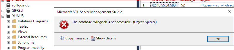 Herhangi bir veritabanında yetkisi yoksa yukarıdaki resimde görmüş olduğumuz gibi hata mesajı ile karşılaşılmaktadır. Bu login’imizin diğer yetkili olmadığı databaseleri görmesini engellemek için bir yetkilendirme yapalım.