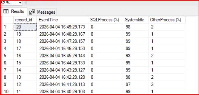 Sistemde anlık bir donma yaşandı ve geçtiyse, o anki CPU kullanımını göremezsiniz. Bu sorgu, son 256 kaydı (genellikle son 1-4 saatlik dilim) getirerek, dar boğazın yaşandığı tam dakikayı ve o esnada yükün SQL Server’dan mı yoksa başka bir yazılımdan mı kaynaklandığını gösterir