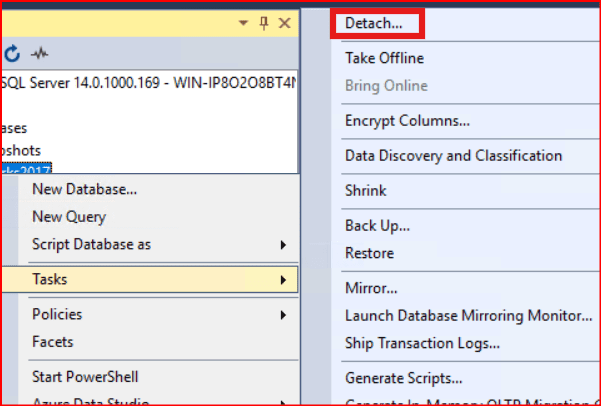 Veritabanımız üzerinde Sağ tıklayıp Task>Detach.. bölümü seçilmektedir.