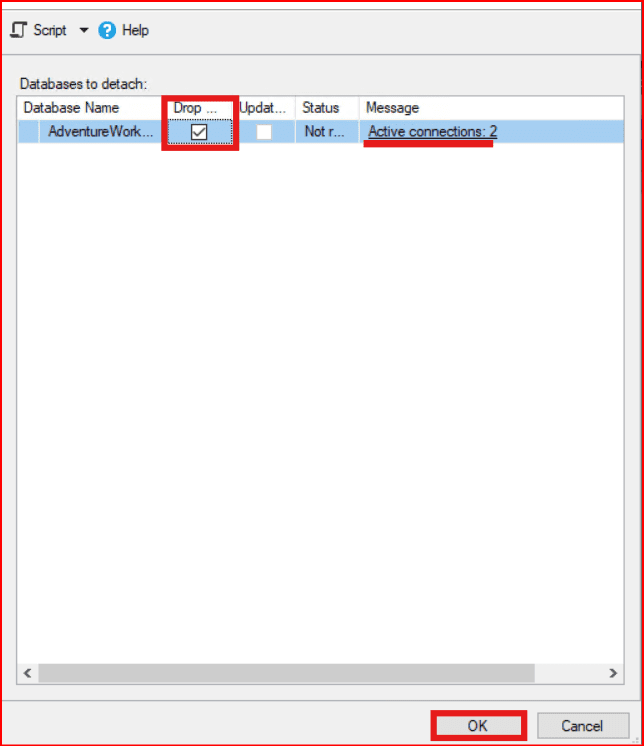 Gelen ekranda Detach Connections kutucuğunun işaretlenmesi gerekmektedir. Bu işaretleme aktif bağlantıları kesmektedir. OK diyerek işlemlerimizi tamamlıyoruz. Message kısmında Active connection sayısı görülmektedir.
