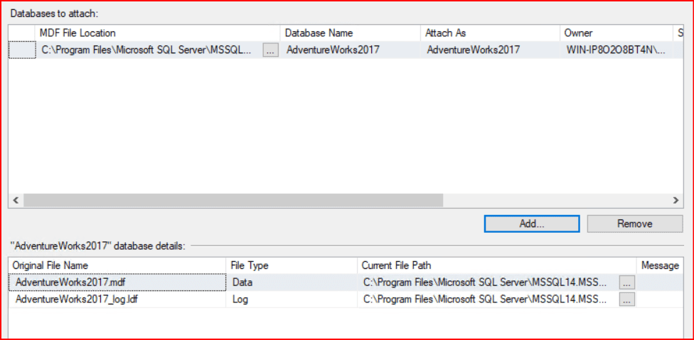 New log file ‘C:\Program Files\Microsoft SQL Server\MSSQL14.MSSQLSERVER\MSSQL\DATA\AdventureWorks2017_log.ldf’ was created.