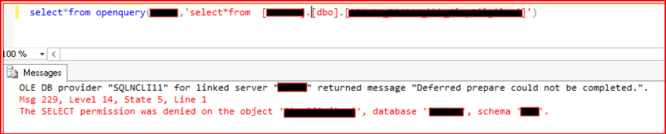 Bu sorun select sorgusu çektiğimizde view’in refarans aldığı tablo üzerinde kullanıcının yetkisi olmamasıdır. Bunun için linked server’ın bağlı olduğu sunucu üzerinde ilgili kullanıcıya bu tablo bazında yetki verilmesi lazım. Hangi tablo üzerinden yetkilendirme için hata mesajındaki belirtilen tabloya yetki veriyorum.