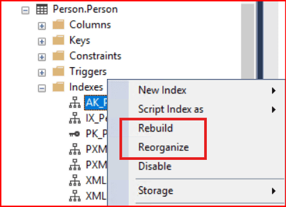 Rebuil ve Reorganize işlemi SSMS arayüzünde yapılabilir. İlgili tablo altında bulunan index yapımıza gelip sağ tıklayıp Reorganize-Rebuild işlemi yapılabilmektedir.