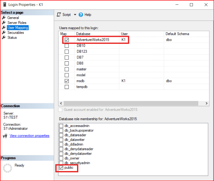 Daha sonra bu kullanıcıyı hedef veritabanına kullanıcı olarak ekledim. Hedef veritabanında sadece public yetkisine sahip olacak şekilde