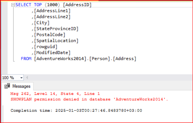 İlgili kullanıcının veritabanı altında sadece okuma yetkisi bulunmaktadır. Sorgumuzun execution plan yapısını incelediğimizde aşağıdaki hatayı vermektedir.