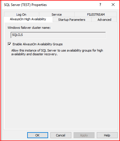 Non Cluster AlwaysOn yapımızı kurabilmek için sql server configuration manager ekranından instance’ımızın olduğu servise gelip alwayson high availability sekmesinin aktif olduğuna bakmalıyız iki sunucumuzda. Cluster ismimizin görünmesi bir sorun teşkil etmez.