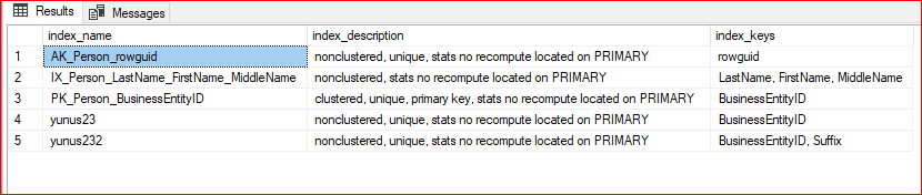 Aşağıdaki komut yardımıyla tablo altında bulunan clustered ve nonclustered index yapılarımızı görebilir. Bu stored procedure yardımıyla hangi kolonlara index atıldığı hangi filegroup üzerinde olduğu görülebilir.