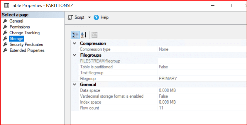Tablomuzun storage bölümünde Hangi filegroup üzerinde olduğu ve table is partitioned kısmında tablomuzun partition yapısında olup olmadığını görebiliriz.
