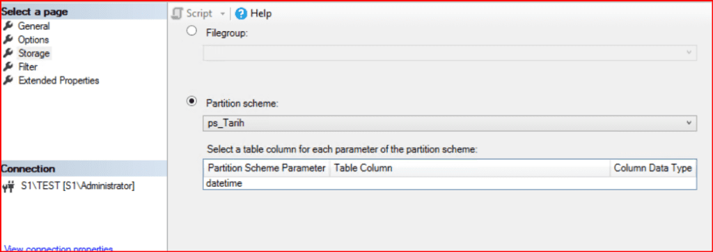 SSMS arayüzünde herhangi bir index oluşturulacağı zaman Storage kısmında partition scheme yapısı seçilmelidir.