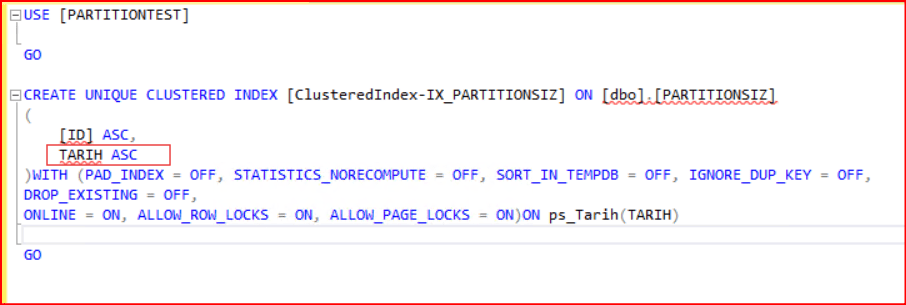 )WITH (PAD_INDEX = OFF, STATISTICS_NORECOMPUTE = OFF, SORT_IN_TEMPDB = OFF, IGNORE_DUP_KEY = OFF, DROP_EXISTING = OFF, ONLINE = ON, ALLOW_ROW_LOCKS = ON, ALLOW_PAGE_LOCKS = ON) ON ps_Tarih(TARIH)