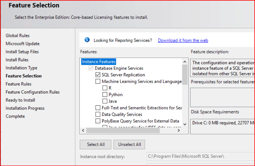Bilgi olması açısından ssql server kurulumunda database engine role’ünün yanına replication role’ünün eklenmesi gerekmektedir. Bu özellik seçilmezse replication servisleri yüklenmez ve sihirbazlar çalışmaz.
