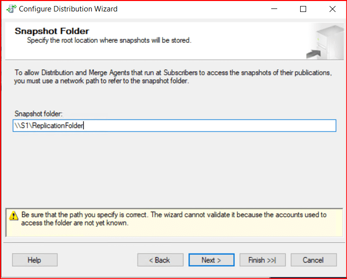 Dağıtımın yapılacağı bir klasör yolu (Network Share) belirtilir. Değişiklikleri takip eden logların ve ilk kurulumdaki veri setinin (snapshot) tutulacağı bir depo oluşturmak için. Replication sistemi veriyi nereye yazacağını ve nereden dağıtacağını bilemez, sistem çalışmaz. Bunun için S1 sunucusu üzerinde önceden yapılandırılan paylaşım yolu belirtilir.