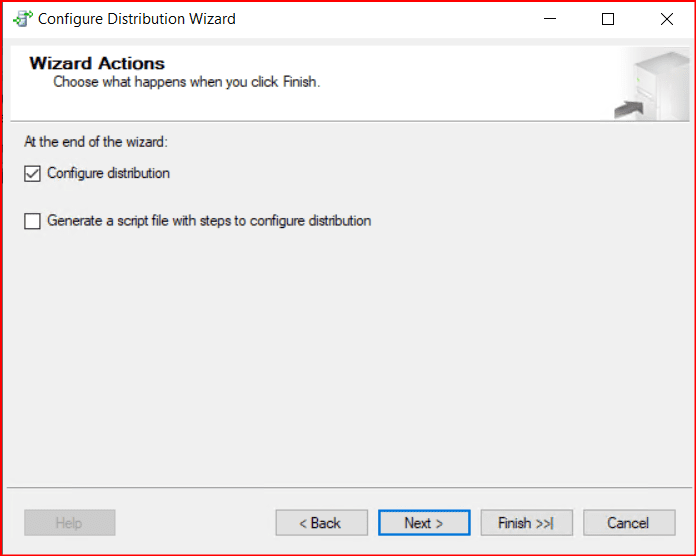 Seçili olan Configure Distribution yapısını gördükten sonra Next diyoruz. İkinci seçeneği işaretlerseniz yapılan işlemin scriptini alabilirsiniz.