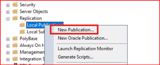 S2 sunucusunda Distributor yapılandırmamız bittikten sonra S1 sunucusundaki instance’a geçerek aşağıdaki gibi Replication bölümünde Local Publications’a sağ tıklayarak New Publication diyoruz.