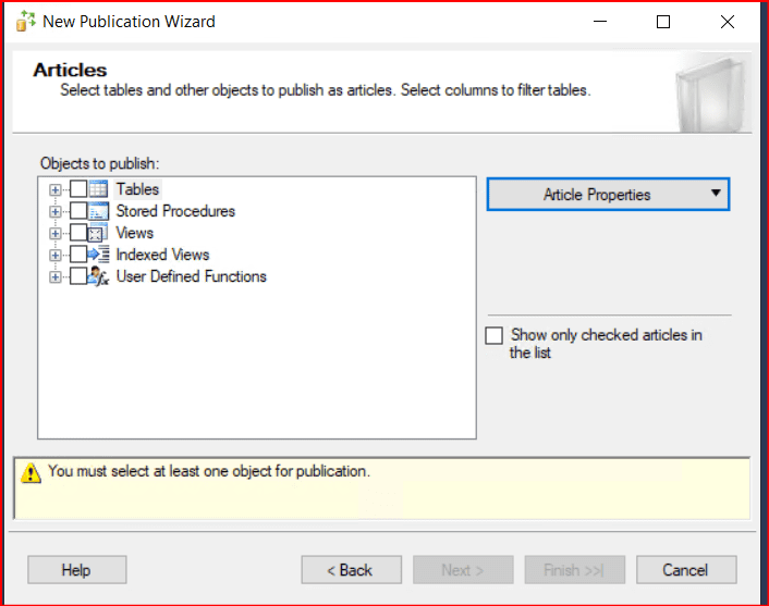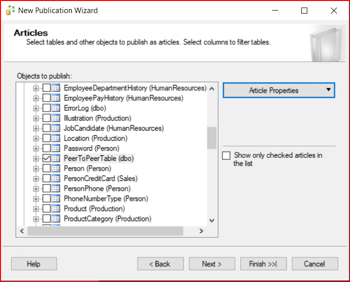 Bir sonraki ekranda article’ları soruyor. Başlangıçta oluşturduğumuz dbo.PeerToPeerTable tablosunu seçip Next diyoruz.