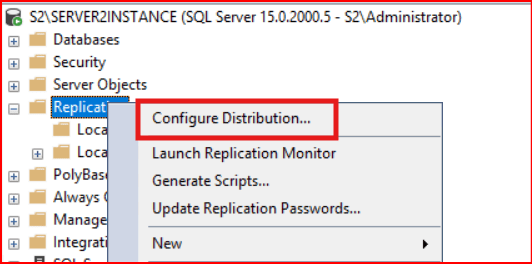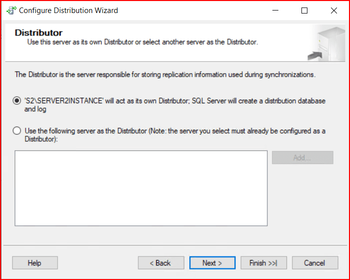 İlk olarak oluşturacağımız yapıya değineceksek iki sunucuda Distributor konfigürasyonunun yapılandırılması gerekmektedir. S1 sunucusunda Transactional Replication kurulumu yaparken bu işlemi yaptığım için tekrar yapma gereği duymuyorum. 2. sunucu için Distributor yapısını oluşturuyoruz.