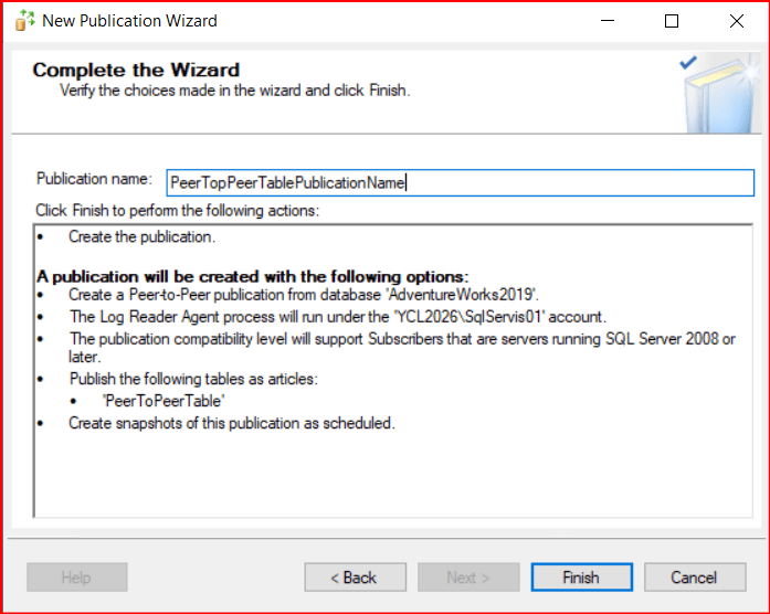 Gelen ekranda Publication’a bir isim veriyoruz ve finish diyerek publication kurulumunu tamamlıyoruz.