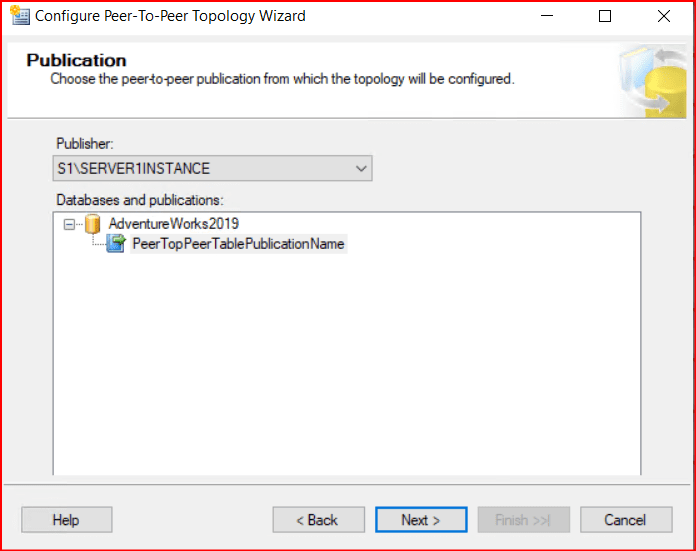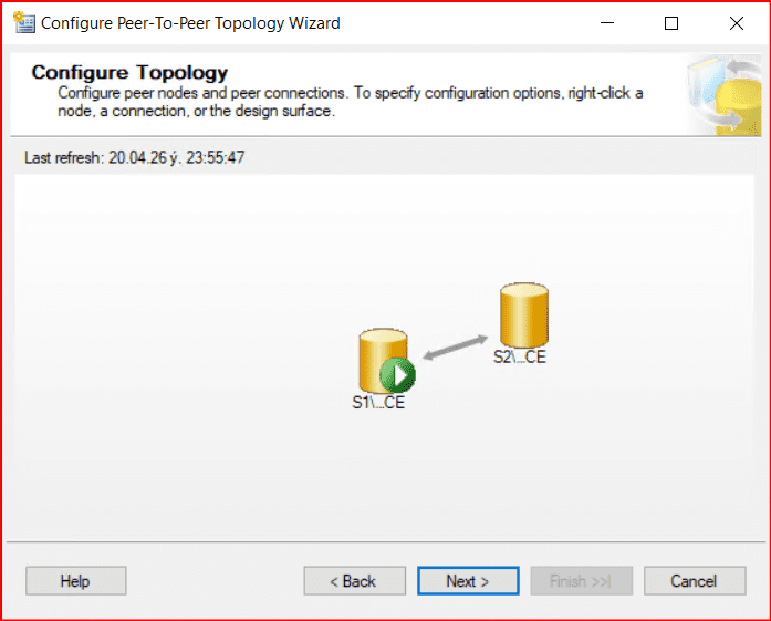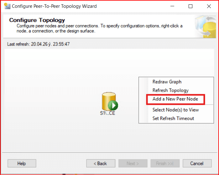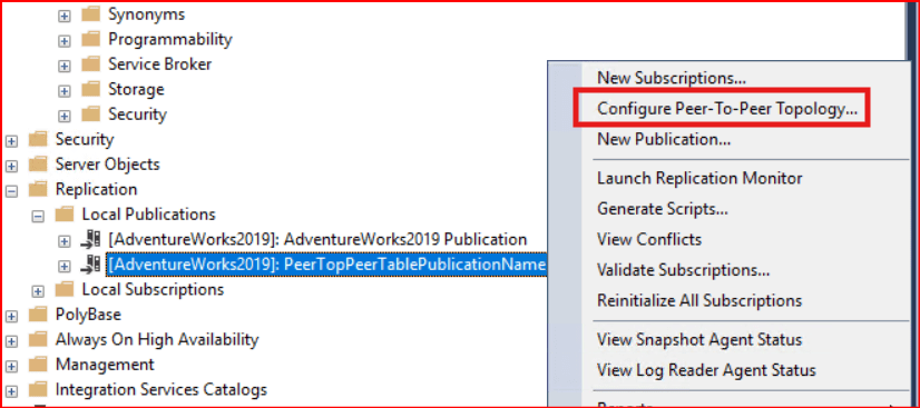 Şimdi aşağıdaki gibi oluşan publication’a sağ tıklayarak Configure Peer-To-Peer Topology… seçeneğini seçiyoruz.