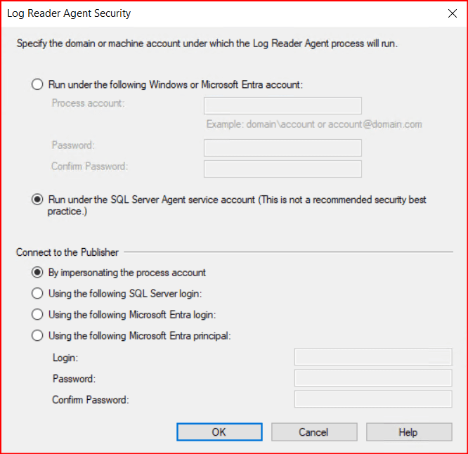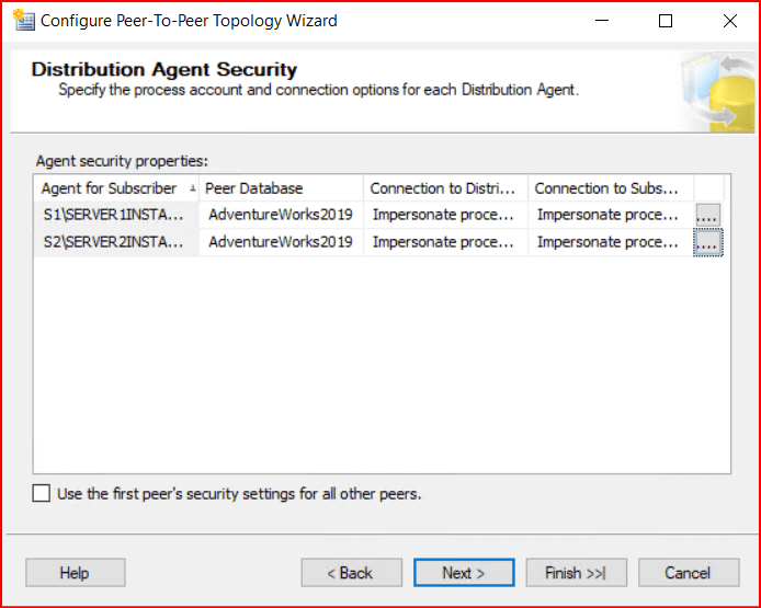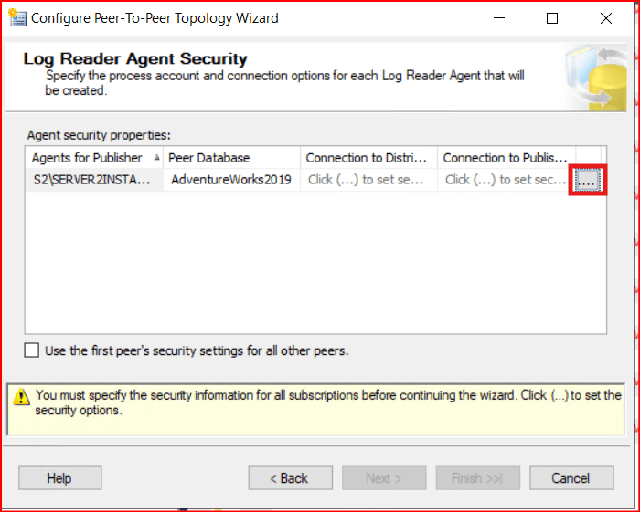 Bir sonraki ekranda 2.instance’daki Log Reader Agent’ın kullanıcı hesaplarını soruyor. 2.instance normalde subscriber ama Peer-To-Peer Replication’da her subscriber aynı zamanda publisher olduğu için bu bilgileri doldurmamızı istiyor. Buraya gireceğimiz kullanıcı hesabı için makalenin başında anlattığımız Log Reader Agent için set edeceğiniz kullanıcının minimum haklarını vermelisiniz. Aşağıdaki ekranda sağ taraftaki …. Ya tıklayarak ilgili kullanıcı seçimimizi yapıyoruz.