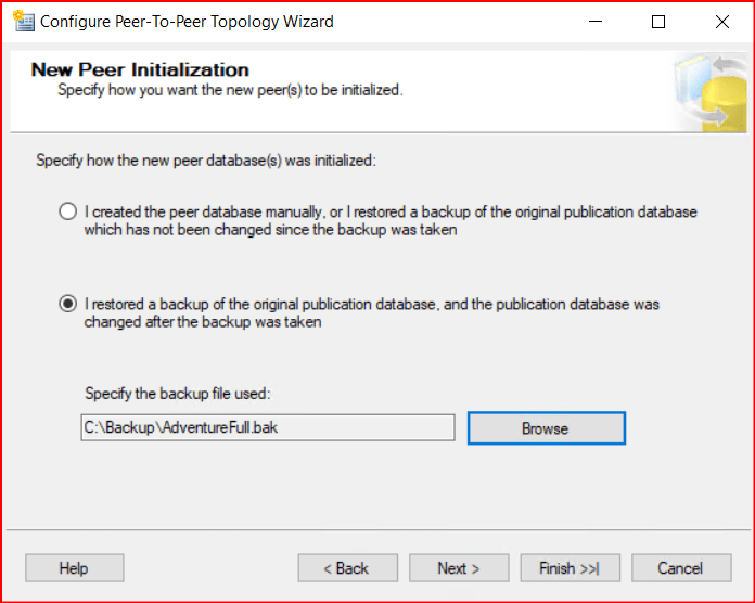 Bir sonraki ekranda I restored a backup of the original publication database… ile başlayan kısmı seçiyoum ve 1.instance’dan 2.instance’a veritabanını backup restore yöntemiyle aktarırken aldığım backup’ın path’ini gösteriyorum.