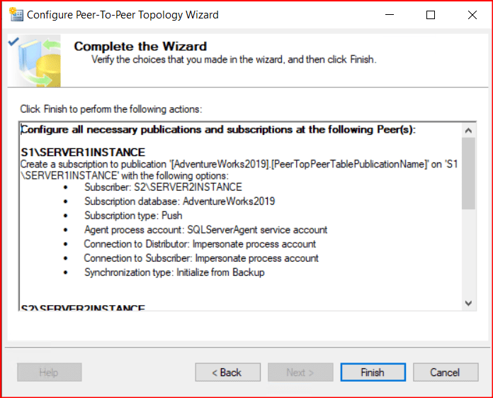 Transactional Replication’dan farklı olarak Snapshot Agent’ı yapılandırmadık ve filtreleme yapmadık. Filtreleme Peer To Peer Transactional Replication’da desteklenmiyor. 1.sunucudan 2.sunucuya olan aktarımıda backup restore yöntemi ile yapıyoruz. Restore sonrasında replike etmeyeceğiniz tabloları 2.sunucudan silmelisiniz.
