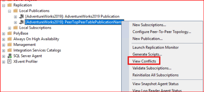 Kurulumumuz bu şekilde tamamlanmış oluyor. 1.Sunucudaki tabloya bir kayıt eklediğinizde 2. sunucuda görebileceksiniz. 2.sunucuda bu kaydı update ettiğinizde ise değişikliklerin 1.sunucudaki tabloya yansıdığını fark edeceksiniz. Aynı anda 1.sunucu ve 2.sunucu aynı satırı update etmeye çalışırsa conflict olacaktır. Oluşan conflictleri aşağıdaki şekilde görebilirsiniz.