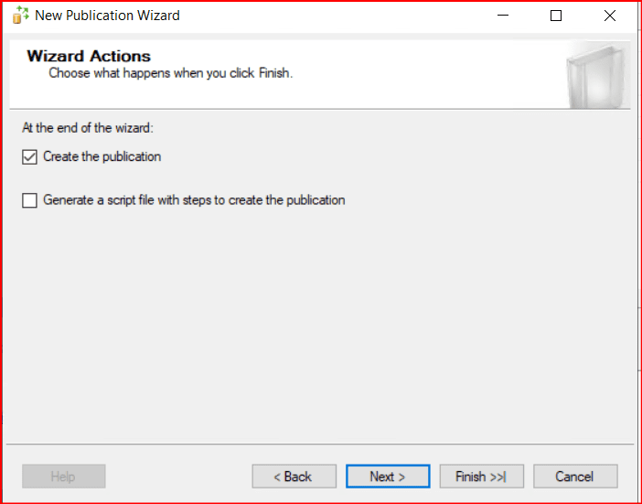 Bir sonraki ekranda aşağıdaki gibi Create the publication seçili iken next diyerek ilerliyoruz.