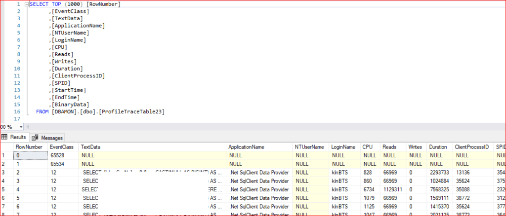 Tablomuza ilgili değerlerin kaydedildiği görülmektedir. SQL Profiler üzerinden yakalanan verilerin doğrudan bir SQL tablosuna aktarılması, ham izleme verilerini anlamlı birer içgörüye dönüştürür. ProfilerAdvisorTakip23 tablosunda biriken veriler sayesinde; hangi sorguların neden yavaş çalıştığını, bu sorguların günün hangi saatlerinde yoğunlaştığını ve hangi execution planların iyileştirilmesi gerektiğini somut verilerle analiz edebiliriz.