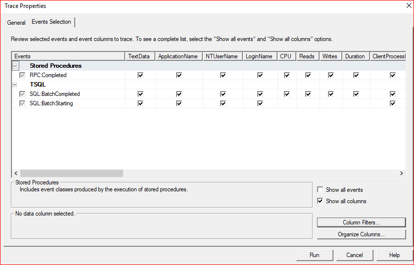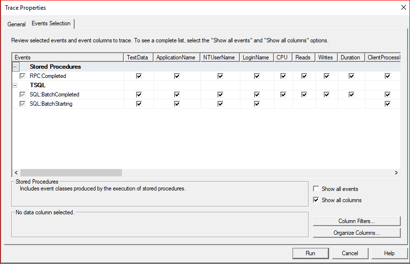 Gelen ekranda Event Selection’a geliyoruz ve aşağıdaki gibi Sadece RPC:Completed ve SQL:BatchCompleted’ı seçiyoruz ve diğerlerinden seçimi kaldırıyoruz. Daha sonra aşağıdaki Show all columns’a tıklıyoruz ve RPC:Completed ve SQL:BatchCompleted üzerindeki seçimi iptal edip tekrar seçiyoruz.(Böylelikle Show all columns’a tıkladıktan sonra gelen kolonlarıda seçmiş oluyoruz.)