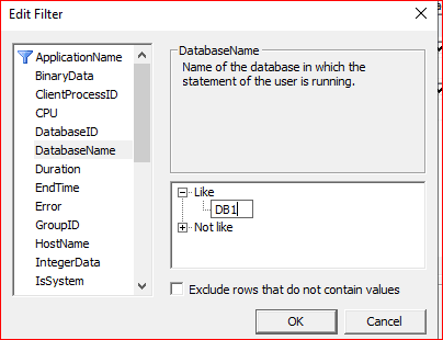 DatabaseName kısmında like bölümünü açıp işlem yapacağımız veritabanını belirtiriz.
