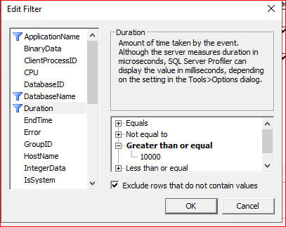 Duration kısmında Grater than or equal kısmında belirli bir milisaniyenin üzerinde olan değerleri çekiyoruz.