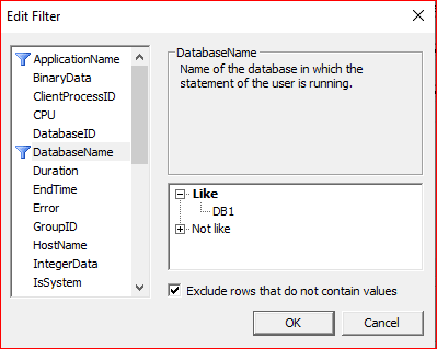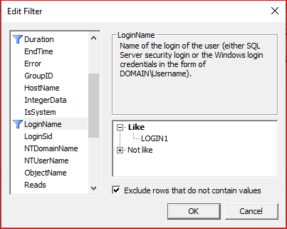 LoginName kısmında hangi login üzerinde işlem yapmak istiyorsak ilgili login seçilmektedir. Farklı filtreleme ifadeleri eklemek istiyorsak ilgili ifadeler seçilebilir.