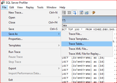 Trace’i durduruyoruz ve File->Save As->Trace Table… diyoruz.