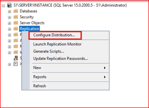 Replication mekanizmasının “postacısı” olan Distribution veritabanını oluşturma adımıdır. SSMS üzerinde “Replication” klasörüne sağ tıklayıp “Configure Distribution” diyoruz.
