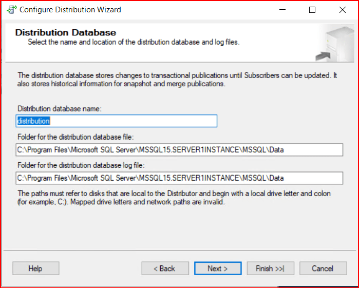 Bir sonraki ekranda aşağıdaki gibi distribution veritabanının data ve log dosyalarının hangi path’lerde tutulacağı bilgilerini girip next diyerek ilerliyoruz. Hiçbir değişim yapmadan default şeklinde bırakıyorum.