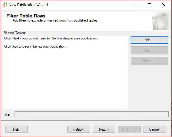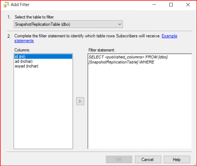 Bir sonraki ekranda bize tablonun tamamını değil de belli bir filtreye göre filtrelenmiş halini aktarmak istersek bu kolaylığı sağlayan ekran geliyor. Aşağıdaki ekrandan Add diyerek istediğimiz filtreyi ekleyip tablonun belli bir kısmını replike edebiliriz. Biz şu anda herhangi bir filtreleme yapmadan next diyerek ilerliyoruz.