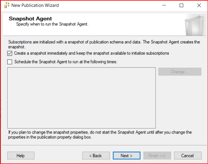 Kaldığımız yerden devam edecek olursak önceki resimde gelen ekranda verilerin snapshot’ının şimdi mi yoksa daha sonra mı alınacağını soruyor. Aşağıdaki gibi Create a snapshot immediately and keep the snapshot available to initialize subscription’ı seçerek, snapshot’ın şimdi alınmasını istediğimizi söylüyor ve next diyerek ilerlemeye devam ediyoruz. Belirli bir zamanda işlemin gerçekleşmesi istenirse Schedule the Snapshot Agent to run at the following times seçeneği ile belirlenebilir.