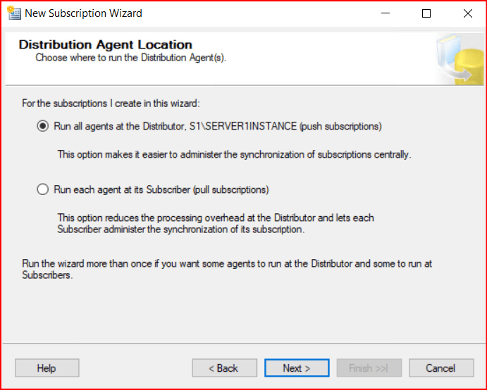 Genel kullanım senaryolarının %90’ında ilk seçenek olan “Run all agents at the Distributor” (Push Subscription) tercih edilir. Detaylandıralım: