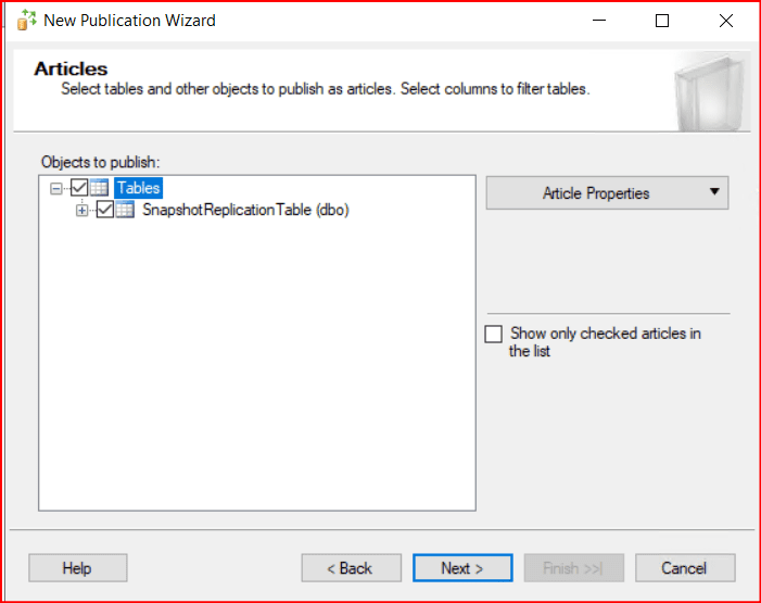 Gelen ekranda article olarak hangi nesne seçimini yapmak istiyorsak ilgili nesne seçimi yapılmaktadır.Biz sadece dbo.SnapshotReplicationTable tablosunu seçip Next diyoruz.