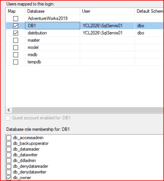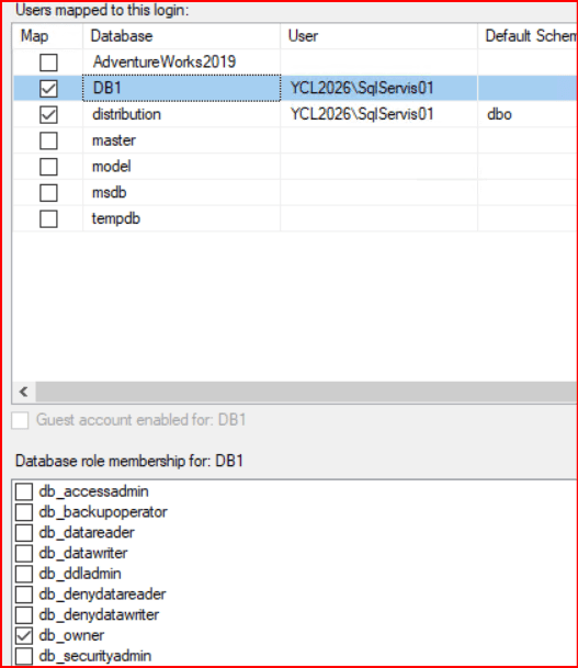 Veritabanları üzerinde tanımlanan servis hesapları ilgili veritabanlarında full kontrol yetkisine sahiptir. Kullanılan servis hesabı başlangıçta oluşturulan Snapshot dosyası üzerinde write yetkisi bulunmaktadır. Log Reader Agent içinde aynı hesabı kullanmış oldum.