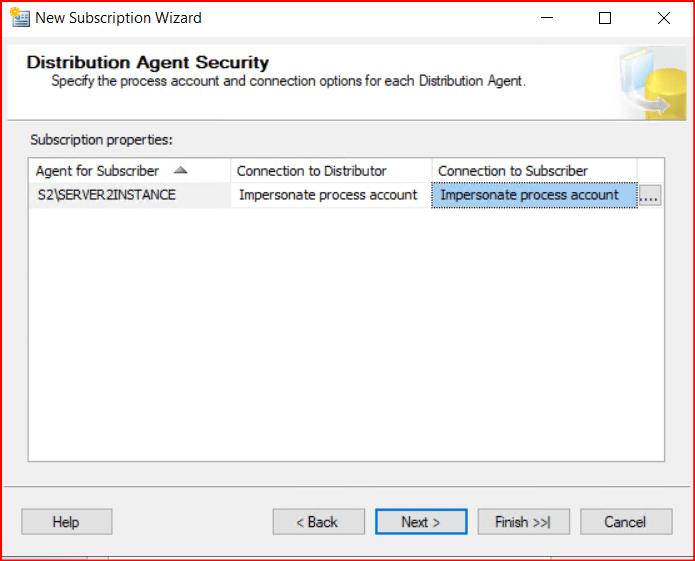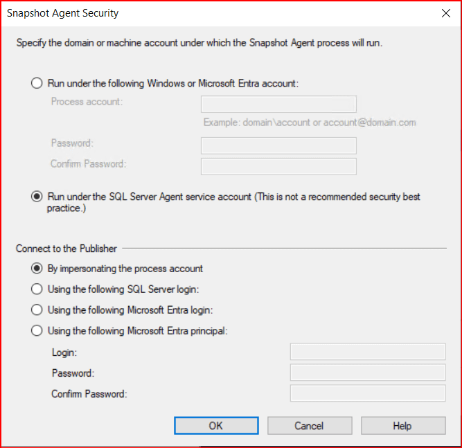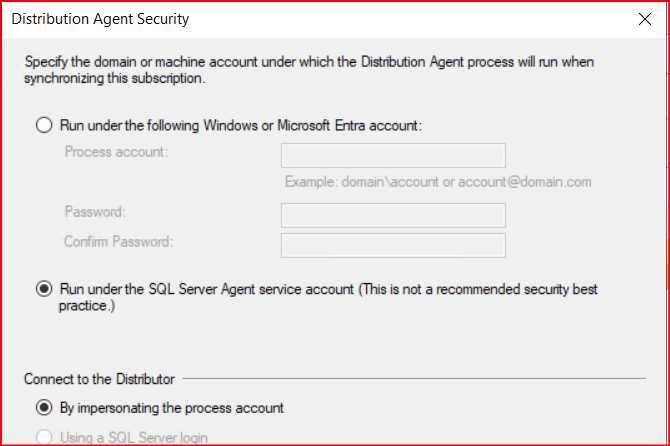 Distribution Agent Security’ye geri dönersek, ben Run under the SQL Server Agent service account’u ve By impersonating the process account’u seçerek ilerliyorum. Tabi SQL Server Agent Servis hesabıma gerekli yetkileri verdim.