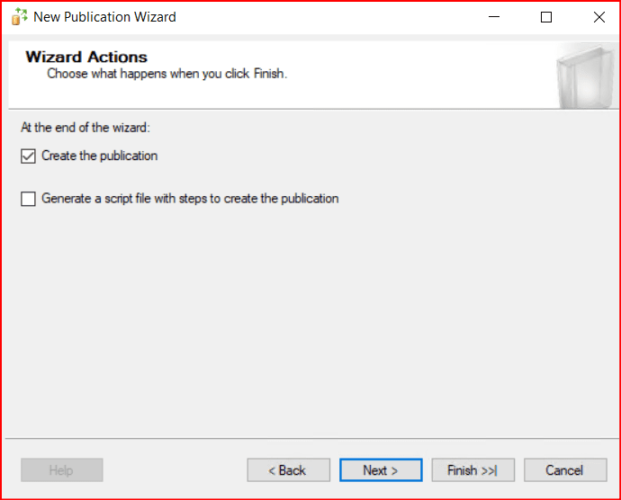 Bir sonraki ekranda aşağıdaki gibi Create the publication seçili iken next diyerek ilerliyoruz.