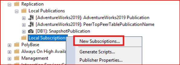 Publication’ı tanımladıktan sonra 1.instance üzerinde aşağıdaki gibi New Subscriptions diyoruz.
