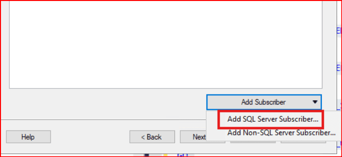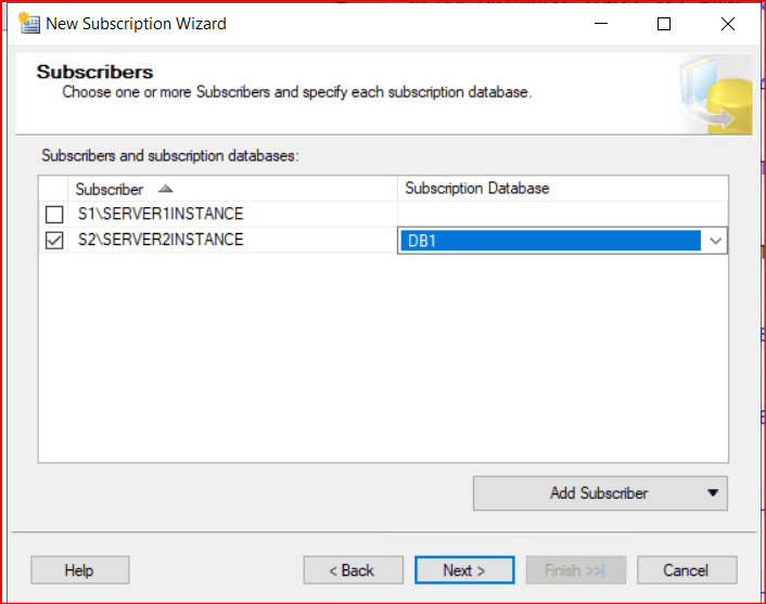 Bir sonraki ekranda aşağıdaki gibi replike edeceğimiz tabloları hangi instance’taki hangi veritabanına replike edeceğimizi soruyor. Add Subscriber diyerek ikinci olan sunucuyu yapılandırıyoruz.
